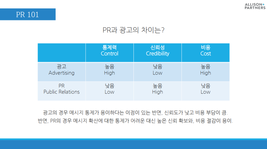 반면, PR의 경우 다양한 매체와 커뮤니케이션을 통해 여러 단계를 거쳐 메시지를 전달하기 때문에 메시지에 대한 통제력이 약합니다. 예를 들어, 이미 잘못 나가버린 기사로 인한 확산 효과의 경우 어떻게 통제할 방법이 없죠. 그래서 일관성 있고 정확한 커뮤니케이션이 중요하다고 합니다! 그리고 오랜 기간 단계별 커뮤니케이션 과정을 거치기에 메시지의 높은 신뢰를 얻을 수도 있다고 하네요!