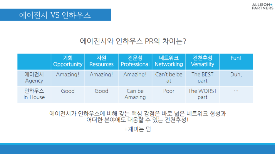 다양한 분야의 클라이언트를 다루기에 각 분야별 전문 PR인으로 성장할 수 있음은 물론, 각 분야의 전문가들이 긴밀하게 협업해 에이전시 자체에 다재다능함을 이끌어낼 수도 있죠. 또, 항상 매체와 접촉하여 언론관계를 쌓아나가기 때문에 네트워킹 역량 또한 인하우스에 비할게 못됩니다.